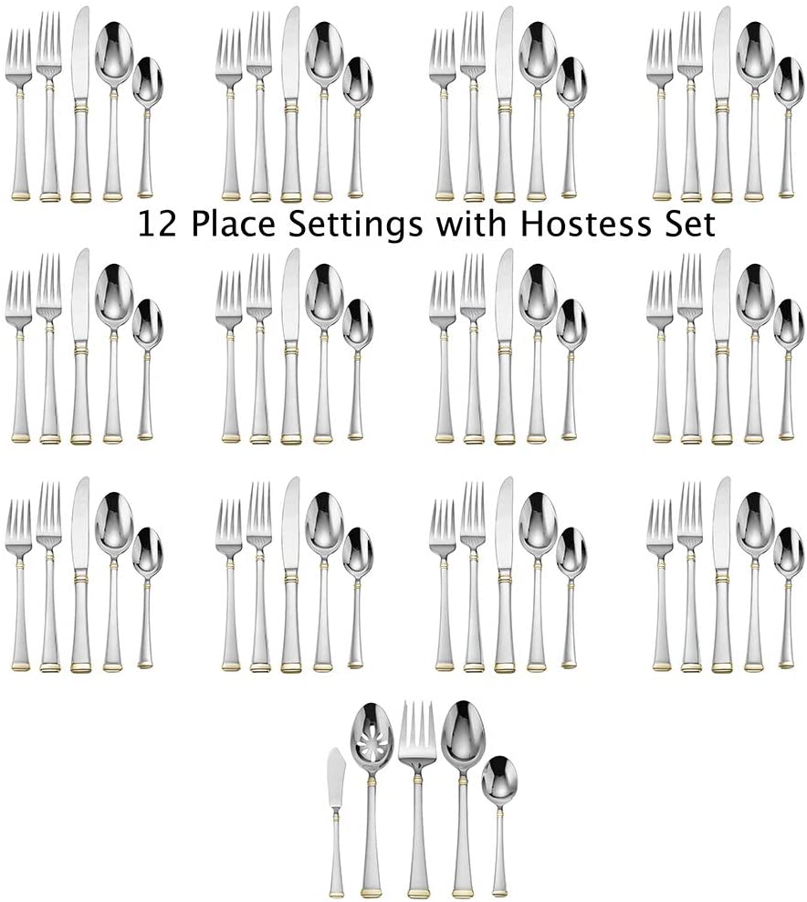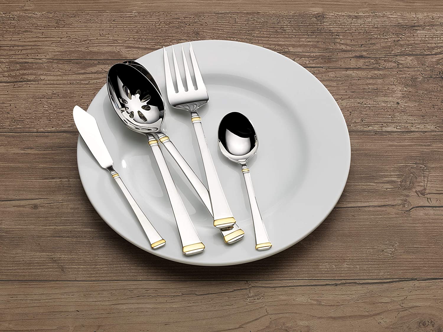 65-PIECE FLATWARE SET: This 65-Piece set includes (12) of each: teaspoon, soup spoon, salad forks, dinner forks, dinner knives. This set also includes (1) of each: teaspoon, cold meat fork, pierced tablespoon, and butter knife.