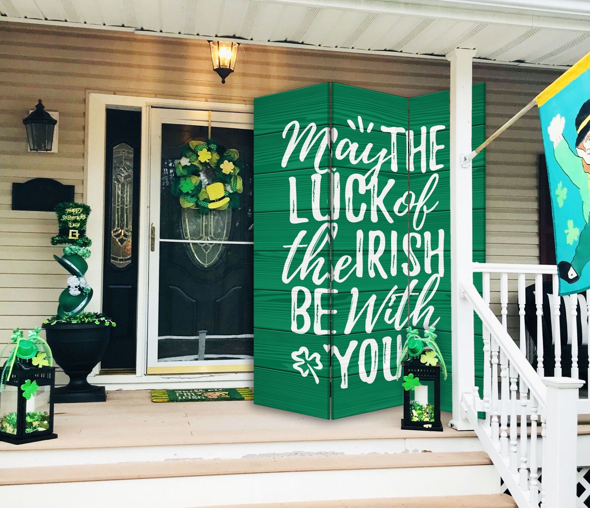 What a unique way to accent your space. This 3 Panel Reversible Irish Art Room Divider Screen gives you multiple looks and the ability to divide your space or use as a decorative art option. This canvas features Irish themed typography on both sides. One side features the endearing saying “May the Luck of the Irish Be With You” in a fun white font over a green shiplap design, while the other side is sprinkled with shamrocks and says “Happy St. Patricks Day” in a beautiful cream colored script. So fun that this screen is two sided and you can celebrate St. Pats in March and leave the more generic Irish saying up the rest of the year. This room divider is light weight and easy to manuver. Some unique ideas for this screen could even include using as a headboard. 72″ x 48″ x 1″ Light weight / Easy fold for storage/ Reversible with two different Irish Saying Designs