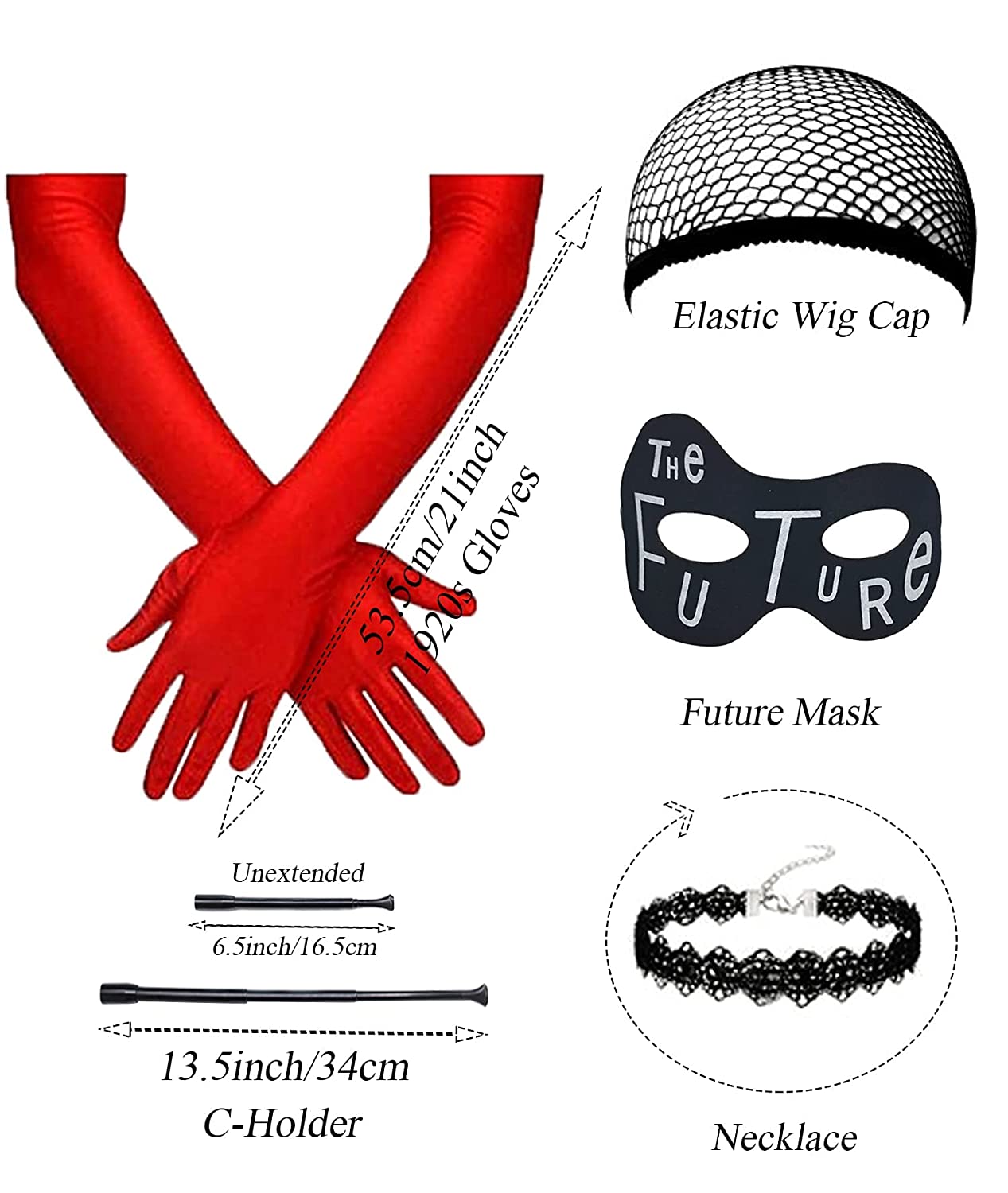Package Includes: 1 Cruella Wig + 1 Future Mask + 1 1920s Gloves + 1 C-Holder + 1 Necklace + 1 Wig Cap