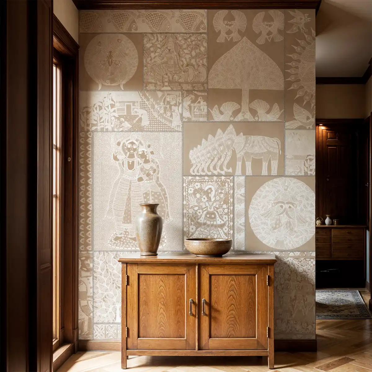 Bring the beauty of traditional artistry into your home with the Geet Madhubani Wallpaper in warm clay beige. Featuring the iconic Madhubani art style, this wallpaper adds earthy charm and character to bedrooms, living rooms, or creative workspaces.